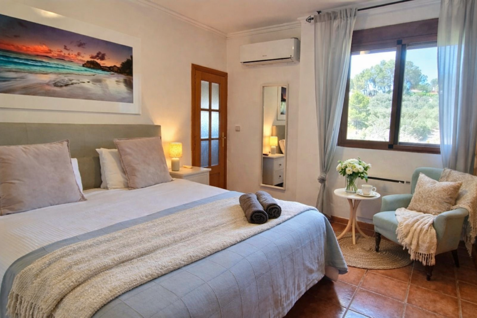 2) Bedroom 2 is across the hallway and comes with a built-in wardrobe, fitted cupboards, a king-size bed, side tables and air conditioning.