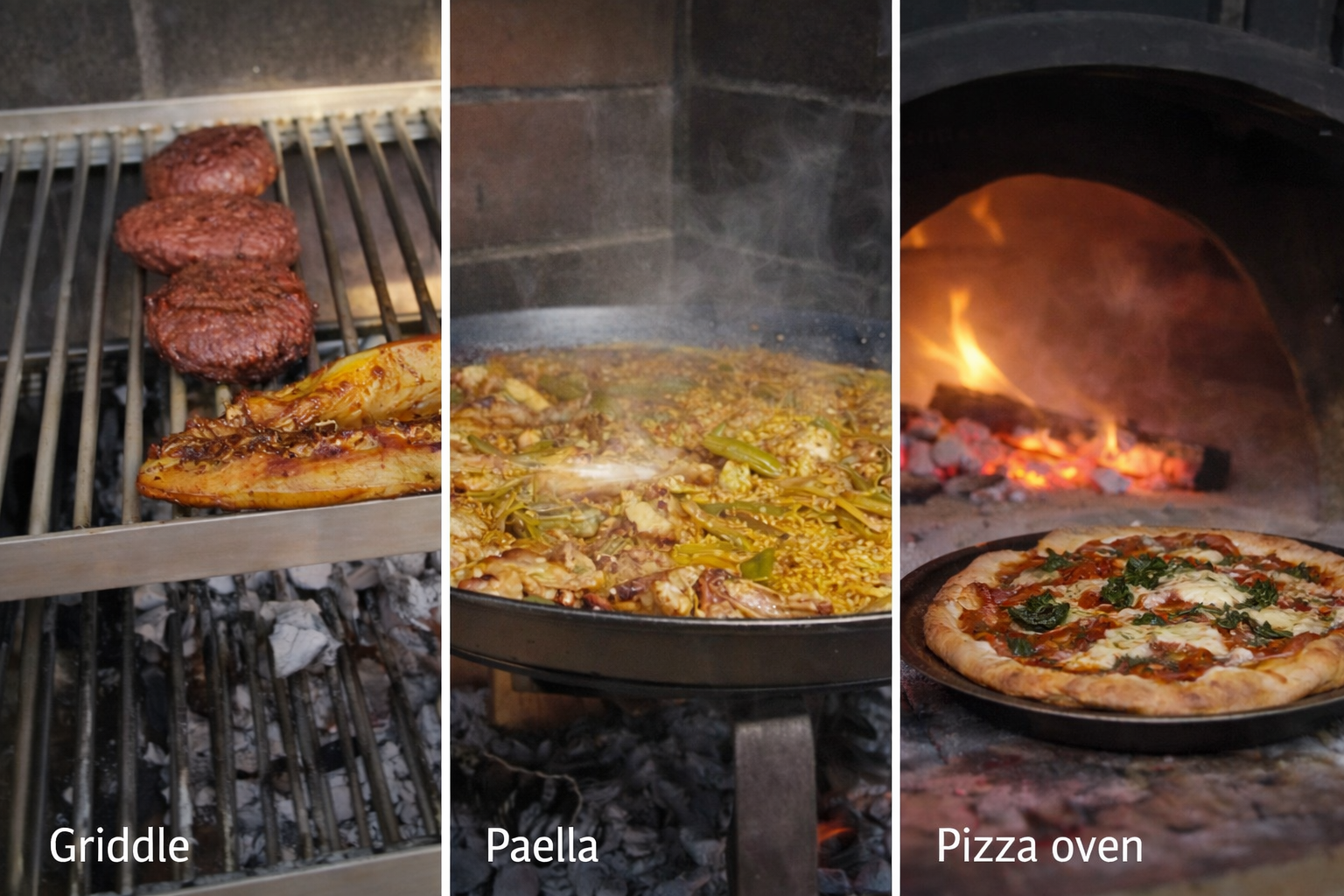 Outdoor Kitchen with griddle, pizza oven and paella facillities