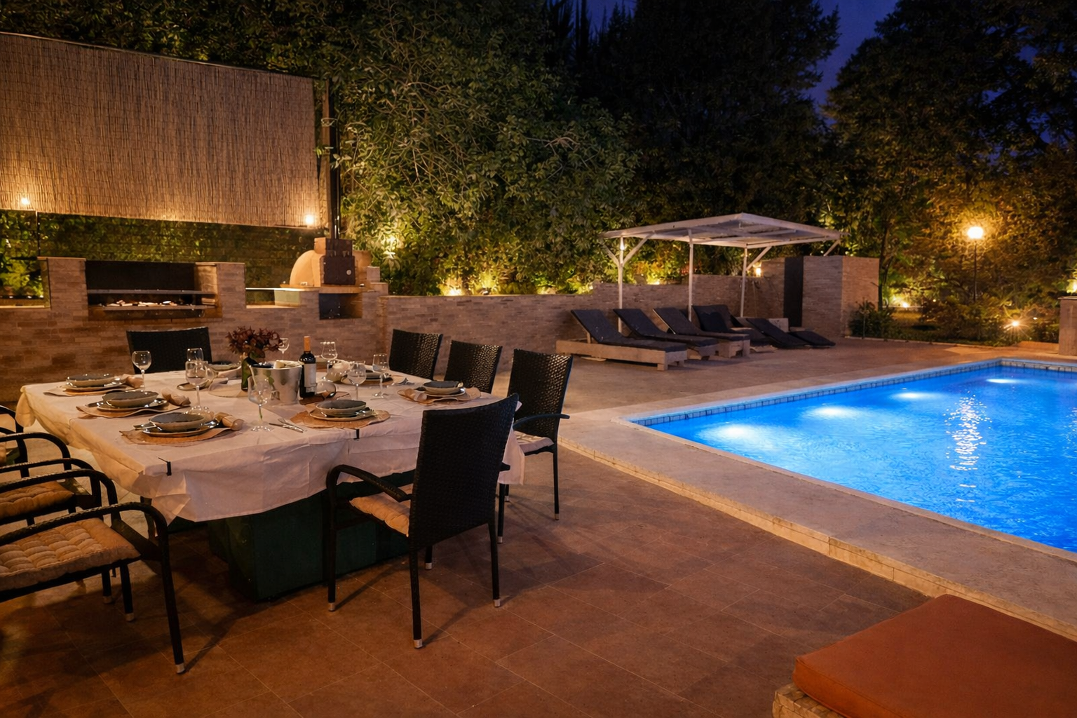 Outdoor dining is a real highlight at Casa Alexandra. The recently refurbished terrace features ambient evening lighting, a large outdoor kitchen, barbecue and pizza oven beside the pool. With beautiful sunsets over the mountains, it’s the perfect place for relaxed evenings and family meals after a day of swimming and exploring.
